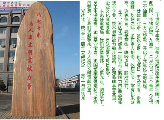 夜以繼日、屢經(jīng)風(fēng)雨,經(jīng)歷了埋頭苦干的默默創(chuàng)業(yè)期,2014年正值企業(yè)創(chuàng)業(yè)20周年之際,已經(jīng)有了科技硬實力和文化軟實力的光達企業(yè),把“攜起手來,為人類文明貢獻力量!”的企業(yè)核心價值深深地鐫刻在門前高大的碑石上,宣言般昭示著企業(yè)的信仰和發(fā)展奮斗的方向,也時刻警醒和激勵著這里的每個員工。
