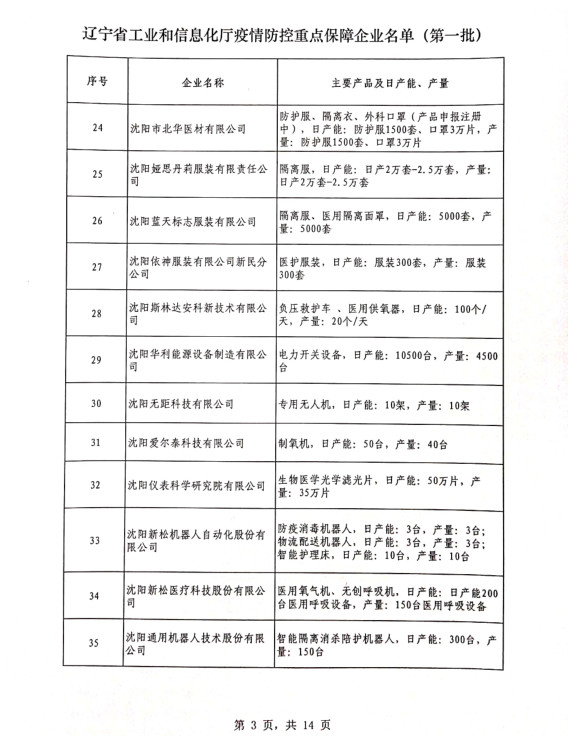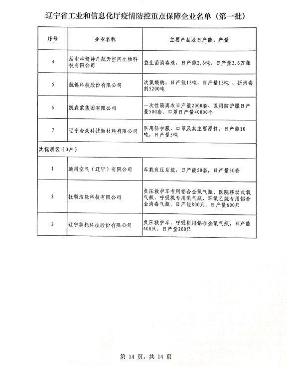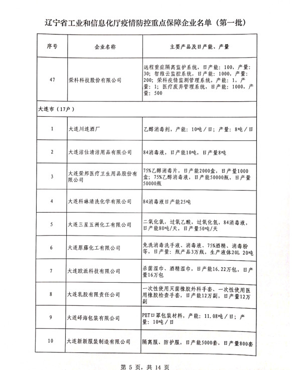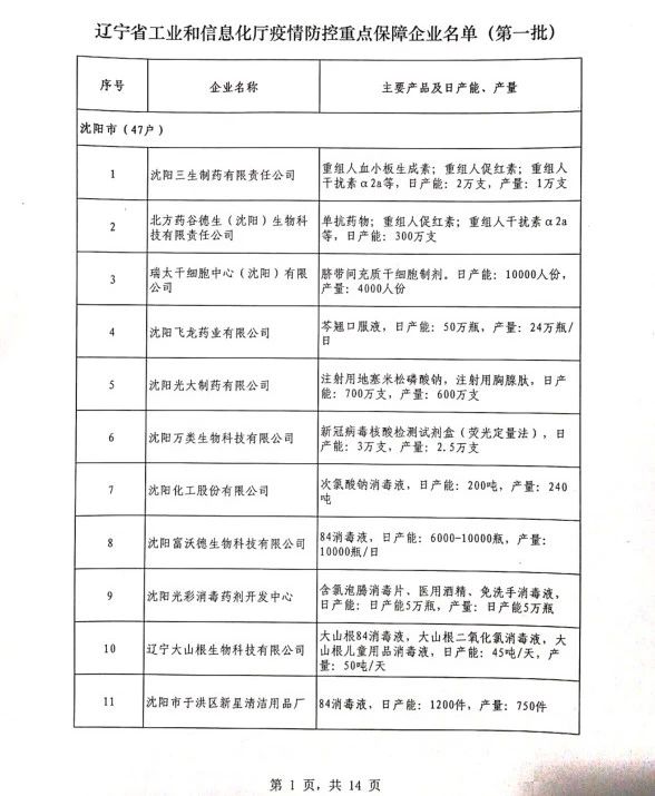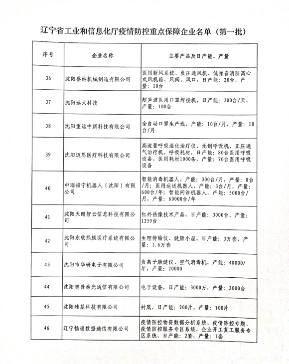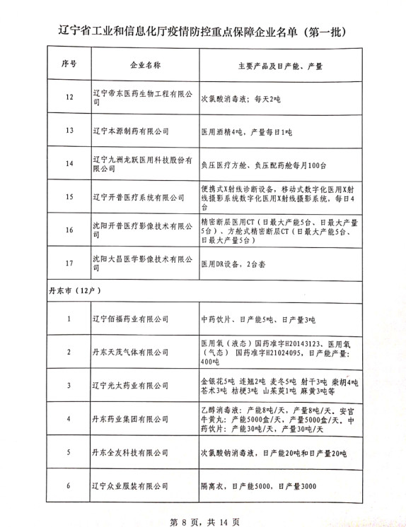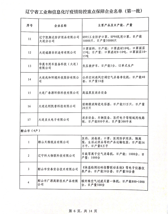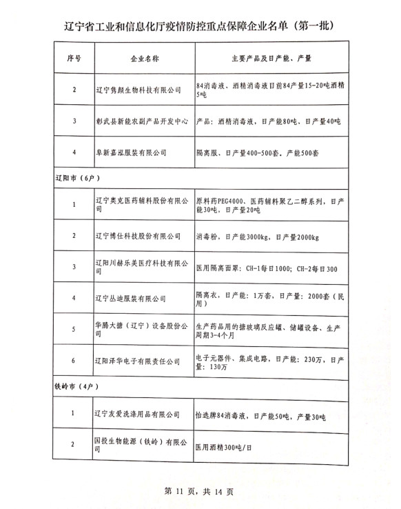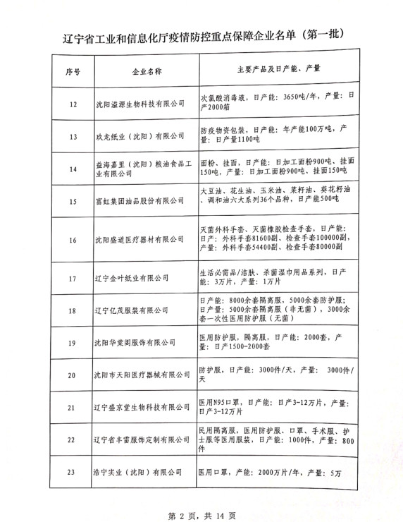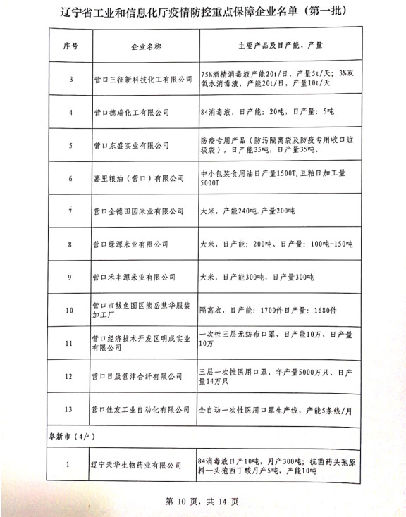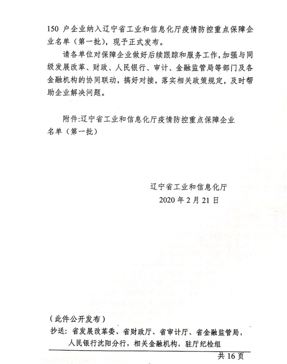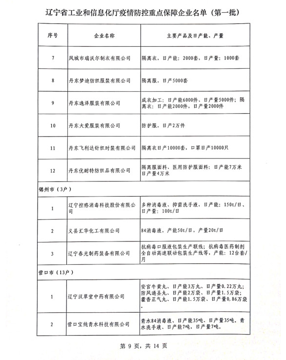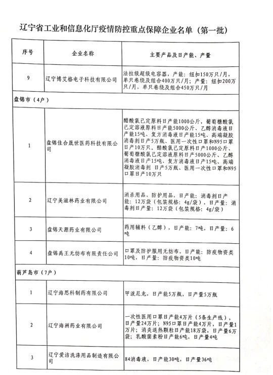 為貫徹落實習近平總書記關(guān)于疫情防控工作的重要講話和指示批示精神,落實黨中央、國務(wù)院和省委、省政府有關(guān)部署,按照《遼寧省人民政府關(guān)于印發(fā)遼寧省應(yīng)對新型冠狀病毒感染的肺炎疫情支持中小企業(yè)生產(chǎn)經(jīng)營若干政策措施的通知》(遼政發(fā)【2020】6號)和《遼寧省工業(yè)和信息化廳關(guān)于規(guī)范省級疫情防控重點保障企業(yè)名單管理有關(guān)事項的通知》(遼工信明電【2020】35號)要求,在各市審核推薦的基礎(chǔ)上,經(jīng)我廳認真研究,決定以下150戶企業(yè)納入遼寧省工業(yè)和信息化廳疫情防控重點保障企業(yè)名單(第一批)。