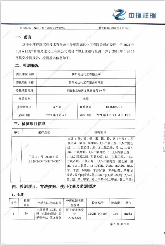 朝陽光達(dá)化工有限公司土壤檢測報(bào)告公示
