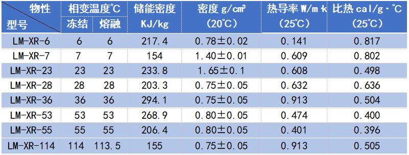 LM-XR系列產(chǎn)品由主儲(chǔ)能劑、相變調(diào)整劑、防過冷劑、防相分離劑、誘發(fā)劑等多組分復(fù)合制備而成。本品通過固-液-固相態(tài)變化實(shí)現(xiàn)熱能的儲(chǔ)存和釋放,具有較高的儲(chǔ)能密度及合適的比熱和導(dǎo)熱系數(shù)。本品不易揮發(fā)、安全可靠,可以反復(fù)使用。